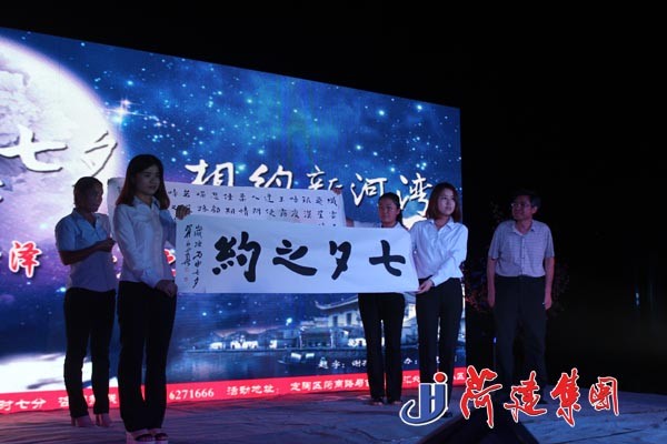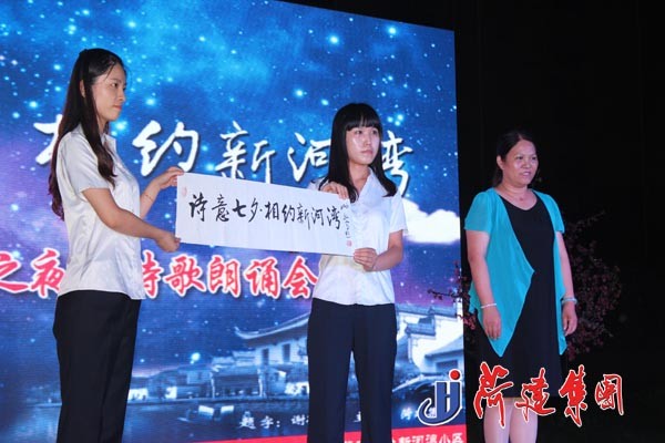 晚会现场,山东省朗诵艺术家协会副主席、菏泽朗诵艺术协会会长周忠良,全国著名作家石耿立,菏泽市电视台著名主持人张志勇等朗诵高手纷纷献彩,为广大观众呈上了一场浪漫而又富有艺术色彩的文化盛宴。全国著名书画家谢孔宾先生亲自为晚会题下“诗意七夕·相约新河湾”几个大字,翟永华、谷鹤等多位著名书画家也纷纷献上大作,为晚会送来美好祝福。集团任永信和李霞同志联台朗诵的《风雨菏建人》,赢得现场观众的阵阵喝彩。