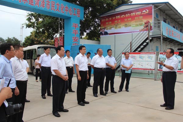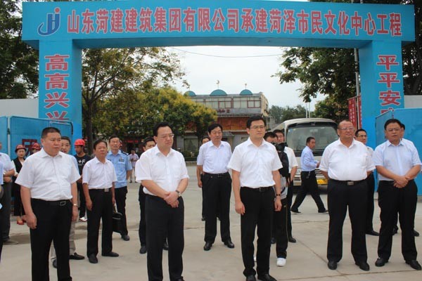 8月31日,市委书记孙爱军一行到集团公司承建的菏泽市市民文化中心调研。市委常委、常务副市长闫剑波,市委常委、秘书长任仲义,副市长王忠想及相关部门主要负责人陪同调研。市人大常委会副主任、市总工会主席丁志刚参加调研并做工作汇报,集团总经理苗林、总工程师邵九宪等参加调研活动。