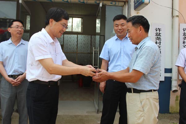 李永亮亲手将收割机钥匙交到该村支部书记手中