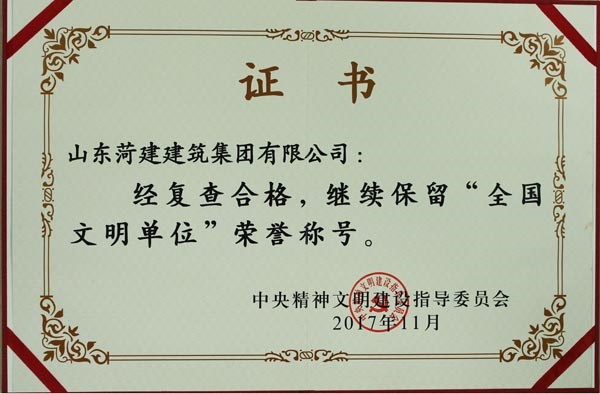 集团公司继续保持“全国文明单位”荣誉称号,即是对文明创建工作的肯定,也是一种鞭策和激励。文明创建永远在路上,下一步工作中,集团公司将不忘初心,继续前进,深入巩固和扩大全国文明单位创建成果,为打造“百年菏建”做出新的更大的贡献。