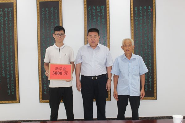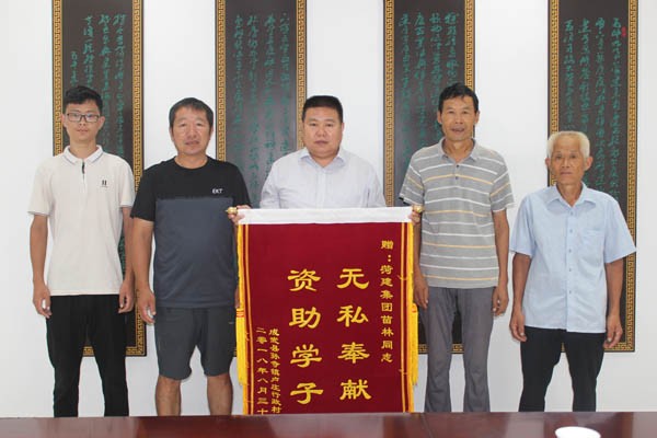 9月1日上午,成武县孙寺镇卢庄行政村党支部书记和贫困户宋茂新及儿子宋永生,将一面“无私奉献资助学子”的锦旗送到集团公司总经理苗林手中,并表示衷心的感谢。