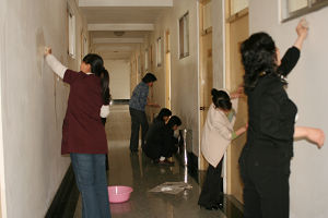 为使庆“五一”迎“五四”活动丰富多彩,二OO九年四月二十八日上午,菏建集团工会、团委和集团机关党支部组织机关人员近四十人,集中进行了擦洗办公楼内墙壁义务劳动。