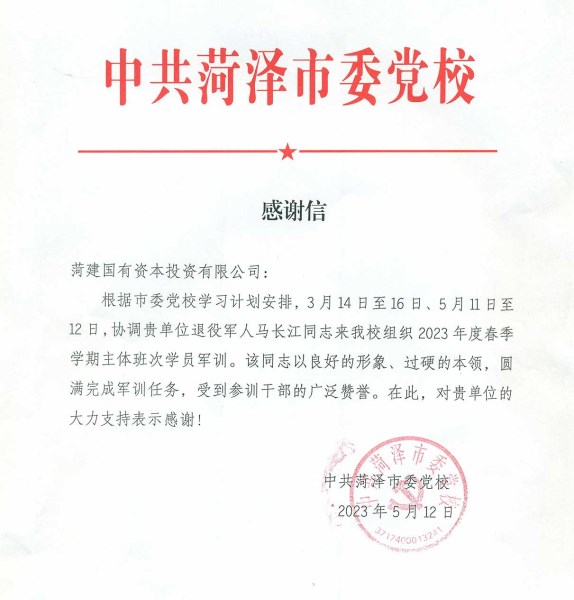 近日,中共菏泽市委党校向伟德国际1949发来感谢信,感谢公司选派优秀职工组织市委党校2023年度春季学期主体班次学员军训,圆满完成了军训任务,对伟德国际1949的大力支持表示感谢。