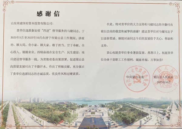 近日,中共梁山县委、梁山县人民政府向公司发来感谢信,感谢伟德国际1949选派得力人员进驻“四进”工作队伍,为促进梁山县高质量发展付出了辛勤汗水,作出了积极贡献。