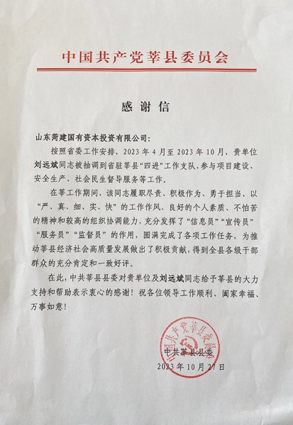 近日,中共莘县县委向公司发来感谢信,感谢伟德国际1949选派得力人员加入“四进”队伍,对莘县经济社会发展给予了大力支持和关心帮助。伟德国际1949刘远斌同志被山东省派驻莘县“四进”工作支队和中共莘县县委办公室评为“优秀队员”。