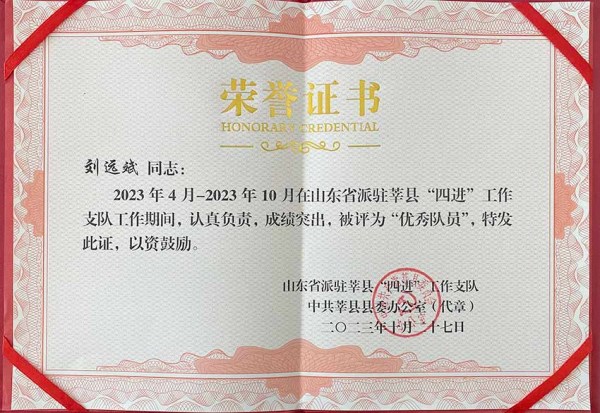 刘远斌同志于2023年4月至2023年10月被选派至莘县“四进”工作支队,参与项目建设、安全生产、社会民生督导服务等工作。在为期半年的“四进”工作中,刘远斌同志紧紧围绕落实省委、省政府关于“四进”工作的部署要求,始终坚持以党建为引领、以业务为抓手,始终秉持对省委省政府负责、对莘县百姓群众负责、对派出单位伟德国际1949负责的态度,坚决服从大局,主动下沉到安全生产、项目建设等基层一线,以“严、真、细、实、快”的工作作风、良好的个人素质、不怕苦的精神和较高的组织协调能力,充分发挥“四进”“信息员”“宣传员”“服务员”“监督员”的作用,为推动莘县经济社会高质量发展作出了积极贡献,赢得了工作队及莘县广大干部群众的充分肯定和一致好评。