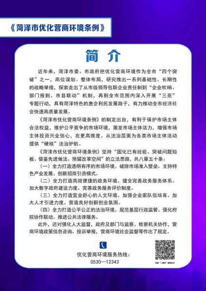 深入实施《菏泽市优化营商环境条例》,着力打造高效便捷的政务环境、公平公正的法治环境、诚信守诺的社会环境、透明有序的市场环境