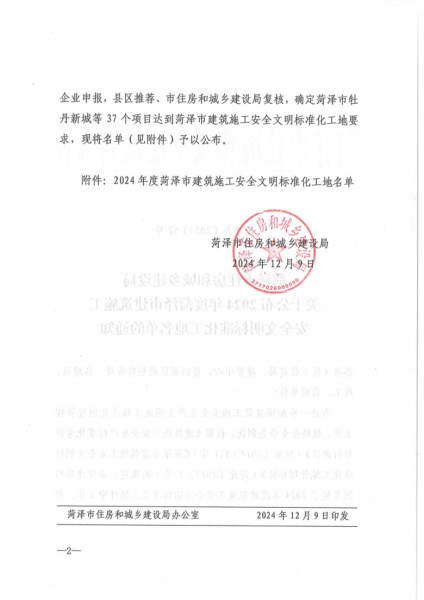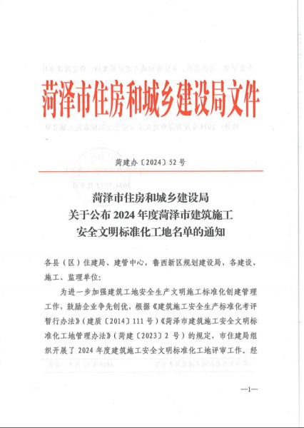 筑安全之基,扬文明之风——菏建集团承建项目荣获2024年度菏泽市安全文明标准化工地