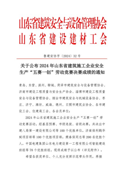 近日,由山东省建筑安全与设备管理协会和山东省建设建材工会联合主办的2024年度山东省建筑施工企业安全生产“五赛一创”劳动竞赛决赛结果揭晓。菏建集团紧扣此次竞赛主题,科学组织竞赛活动,积极落实竞赛措施,经基层预赛、市级选拔和省级决赛三个阶段,荣获“优胜单位”、“优胜班组”和“优胜个人”多项荣誉称号。