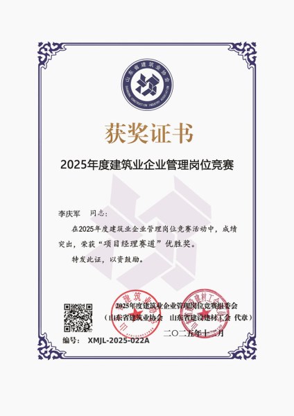 其中,王冬艳同志荣获“财税管理赛道”优胜奖,展现了财务团队在合规运营、成本优化与价值创造等方面的专业水准;李庆军同志荣获“项目经理赛道”优胜奖,刘广刚同志获“项目经理赛道”优秀奖,体现了菏建集团在项目管理、质量控制和风险防范等方面扎实的管理能力。该奖项作为山东省建筑业企业管理岗位的最高荣誉之一,不仅是对获奖者个人能力的认可,更是菏建集团在人才培养与梯队建设上取得显著成效的有力证明。