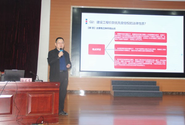 本次培训紧扣施工板块业务核心痛点与法律实务难点,以“建设工程价款优先受偿权常见实务问题解答”为主题,围绕建设工程价款优先受偿权的基本概念、权利行使、受偿范围、权利效力以及工程总承包中的优先受偿权等五大维度,对40项常见实务问题展开系统、深入的解读。从优先受偿权的权利主体界定、行使期限与方式,到受偿范围划分、权利对抗效力,再到工程总承包模式下分包人权利、勘察设计费是否纳入受偿范围等特殊情形,均结合现行法律法规、司法解释及典型司法案例,逐一厘清实务误区、明确裁判规则,让参训人员清晰掌握建设工程价款优先受偿权在司法实践中的适用标准和实操要点,切实提升遇事找法、解决问题靠法的能力,助力大家将所学知识精准应用到实际工作中,确保在业务开展中能够依法、及时、正确行使建设工程价款优先受偿权。