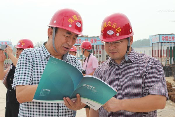 集团党委副书记任永信(左)向大众网菏泽站站长高登福介绍集团《企业文化形象手册》