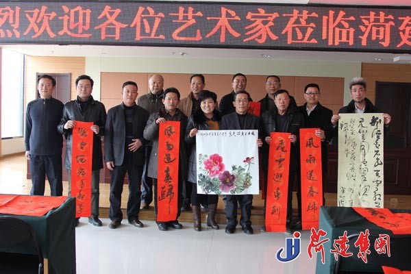 在集团二楼会议室活动现场,书画家们现场泼墨挥毫,吟诗作画,气氛热烈,赢得了参观人员的阵阵赞叹声。艺术家们现场创作的一幅幅春联、书画作品,生活气息浓郁,创作手法新颖,表现视角独特,展示着中国书画艺术的深厚底蕴,既有积极向上的思想内涵,又有较强的艺术感染力和较高的欣赏价值,极大开阔了职工的视野,受到广大职工的热烈欢迎。上午,书画大家们共创作了作品50余幅,全部现场赠送给菏建集团。